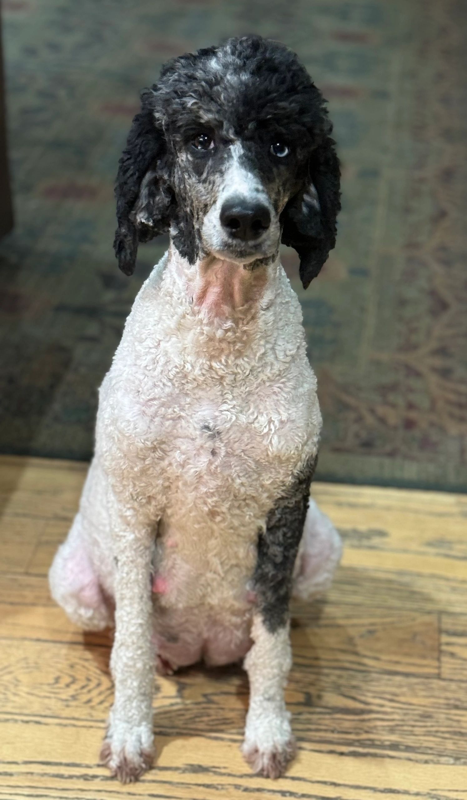 Tink is an AKC black and white (Merle) tri poodle. Tink is very polite and sweet. She likes to sit as close as possible and lean in for scratches.